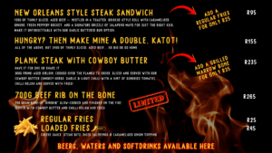 Welcome to STEAK by Reel and Rustic, The World’s Smallest Grill Room. From the heart of Mossel Bay, we serve one thing only: a New Orleans-inspired steak sandwich that speaks for itself. Aged beef, flame-kissed to perfection. Caramelised onions. Rocket. Jalapeño mayo. All stacked on a toasted bun and grilled with precision. That’s it — no frills, no fuss, just flavour and fire.